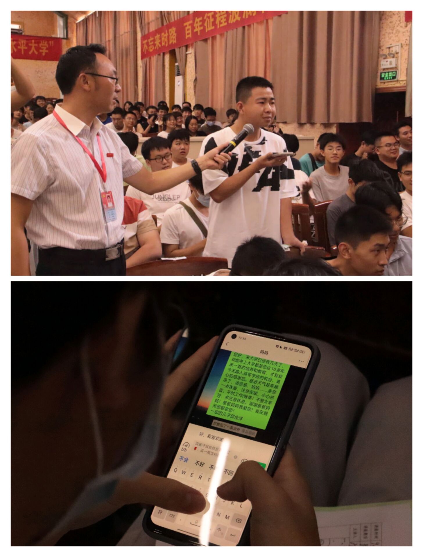 饶先发以一道接水谜题引导师生体会大学与高中思维方式的不同。又用新生合影和下宿舍所拍图片讲述了新生们初入大学校园的生活趣事。他提出,学生在大学重要的是学习怎样读书、怎样做事、怎样与人相处及怎样做人。