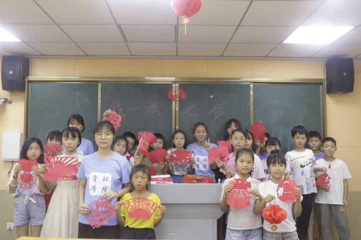 课上实践队队员用以“科技强国”“我爱中国”为内容的红色卡纸教导学生手工实践。同时实践队队员详细教学如何剪纸,向学生讲解了卡纸内容的寓意。为保证安全,每四位学生由一位实践队队员在一旁看护教学。在实践队队员和学生的共同的努力下,以爱国为主题的剪纸终于成型。实践队队员们和学生们都露出了开心的笑容。