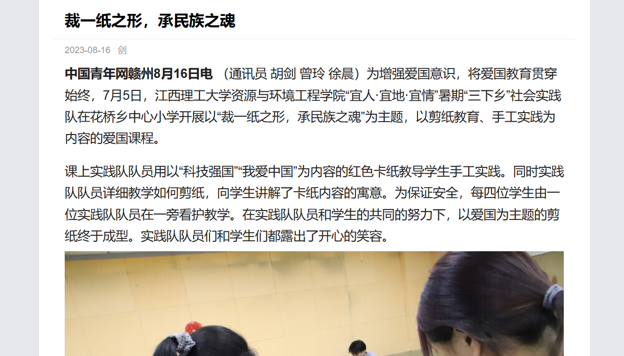 中国青年网赣州8月16日电 (通讯员 胡剑 曾玲 徐晨)为增强爱国意识,将爱国教育贯穿始终,7月5日,乐投平台“宜人·宜地·宜情”暑期“三下乡”社会实践队在花桥乡中心小学开展以“裁一纸之形,承民族之魂”为主题,以剪纸教育、手工实践为内容的爱国课程。