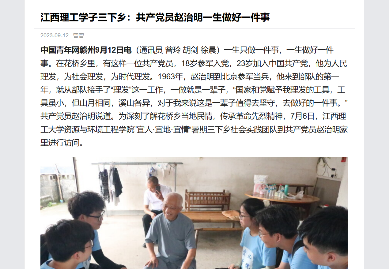 中国青年网赣州9月12日电(通讯员 曾玲 胡剑 徐晨)一生只做一件事,一生做好一件事。在花桥乡里,有这样一位共产党员,18岁参军入党,23岁加入中国共产党,他为人民理发,为社会理发,为时代理发。1963年,赵治明到北京参军当兵,他来到部队的第一年,就从部队接手了“理发”这一工作,一做就是一辈子,“党和国家赋予我理发的工具,工具虽小,但山月相同,溪山各异,对于我来说这是一辈子值得去坚守,去做好的一件事。”共产党员赵治明说道。为深刻了解花桥乡当地民情,传承革命先烈精神,7月6日,乐投平台”宜人·宜地·宜情“暑期三下乡社会实践团队到共产党员赵治明家里进行访问。