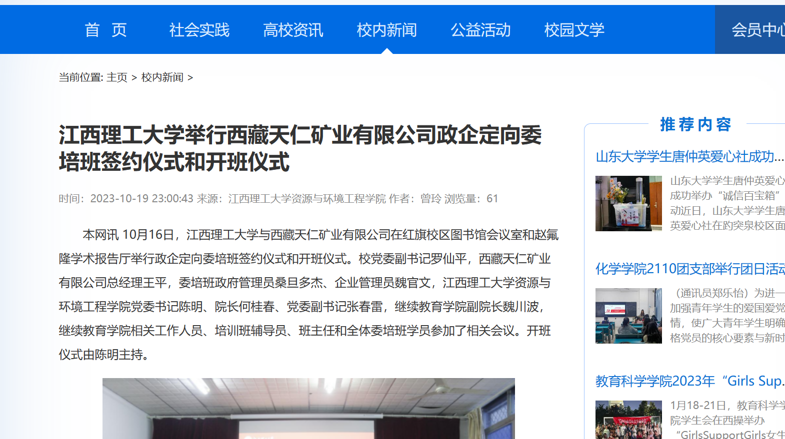 本网讯 10月16日,江西理工大学与西藏天仁矿业有限公司在红旗校区图书馆会议室和赵氟隆学术报告厅举行政企定向委培班签约仪式和开班仪式。校党委副书记罗仙平,西藏天仁矿业有限公司总经理王平,委培班政府管理员桑旦多杰、企业管理员魏官文,乐投平台党委书记陈明、院长何桂春、党委副书记张春雷,继续教育学院副院长魏川波,继续教育学院相关工作人员、培训班辅导员、班主任和全体委培班学员参加了相关会议。开班仪式由陈明主持。