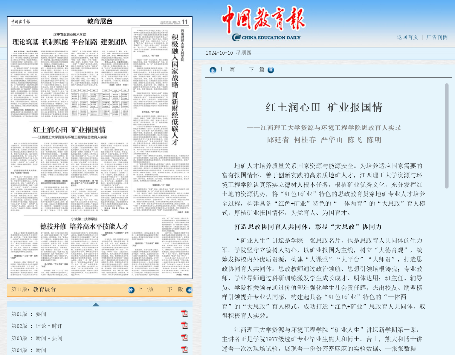 一是成立课程思政教学研究中心,深挖红色文化和矿业精神富矿,将其中蕴含的育人元素融入课程、教材、实验,打造119个课程思政资源库、案例库等,实现课程门门有思政;二是积极推进思政育人模式创新,基于“双融入、三合力、两阵地”,将“红色文化+矿业精神”两大育人元素深度融入并贯穿地矿专业育人全过程;三是创新课程体系,将红色文化纳入人才培养方案,设置“红色文化”必修课,构建涵盖“一门红色文化必修课+六大模块+三类训练+X门新工科拓展课”的“1+6+3+X”课程新体系。资源与环境工程学院结合赣南苏区红色资源优势与矿业学科特点,打造“矿业先锋”红色文化育人项目,构建“紧扣红色矿业文化引领一条主线,坚守课堂主阵地、实践主战场、文艺主旋律三维立体阵地”一体化的实践育人模式,将红色文化融入课程思政教育、社会实践教育、校园文化教育等各个环节,引导大学生强化矿业报国志向。