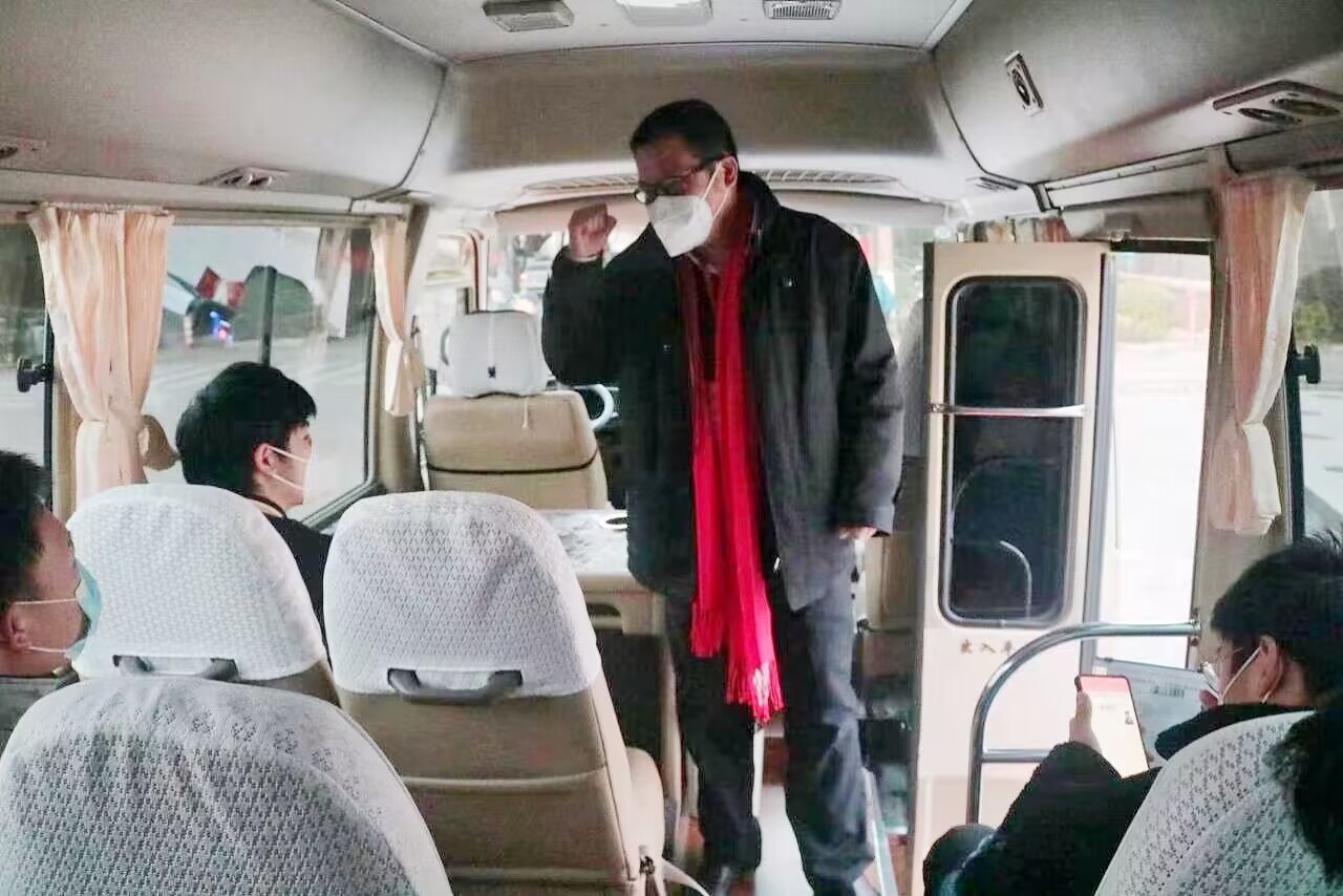 陈飞在车上对考研学子鼓励说道“你们必将翼展宏图,研途璀璨,考研加油!”。他还特意戴着一条寓意着“红红火火、鸿运当头”的红围巾,希望这条红围巾能给考研学子带来好运