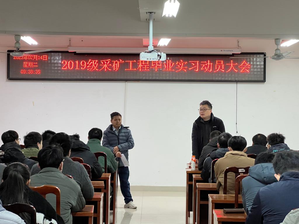 本网讯 为进一步做好学生毕业实习工作,引导学生做到安全有序,推进毕业实习工作的顺利开展。2月14日,我院在黄金校区逸夫楼第二会议室召开2019级采矿工程专业毕业实习动员大会。采矿工程系主任曾鹏、副主任陈青林、带队教师以及采矿工程、采矿工程(中外)专业2019级全体同学参加了此次会议。会议由陈青林主持。