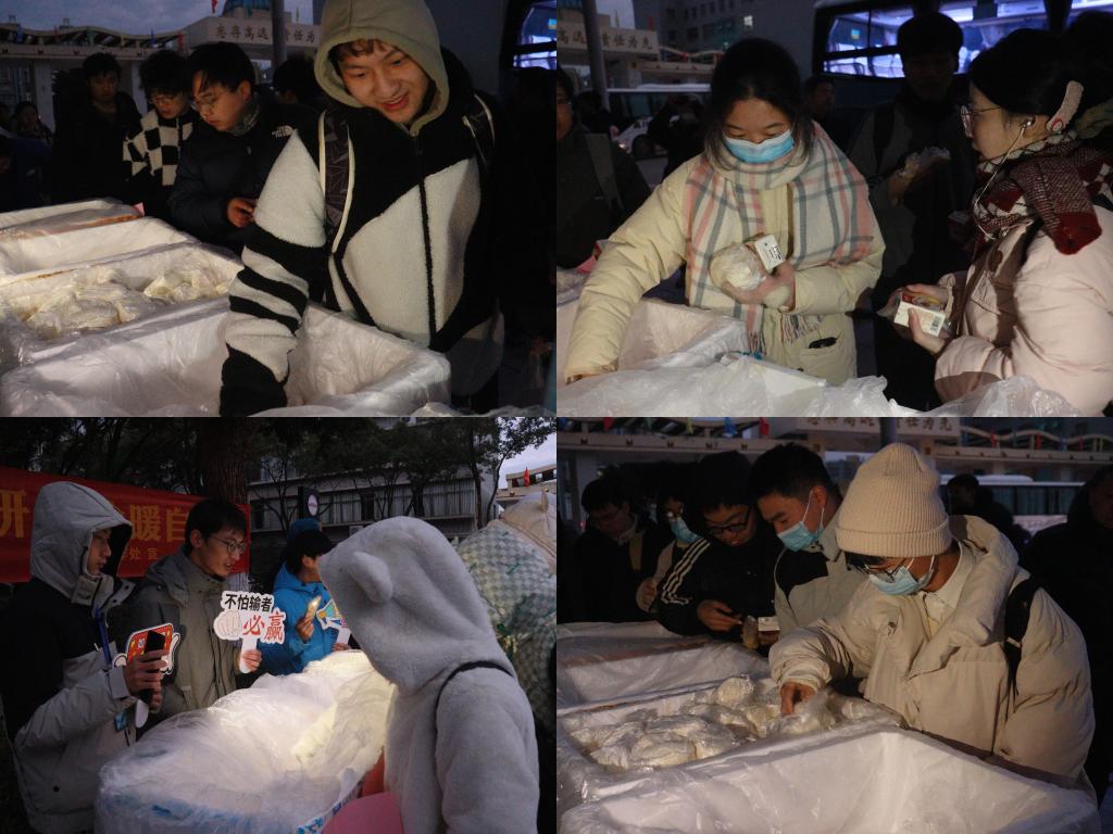 天还未亮,辅导员和志愿者引导考研送考大巴车在指定地点停放,并组织志愿者们搬运爱心早餐和做好引导工作。考研学子们陆续在志愿者的指引下挑选自己喜欢吃的爱心早餐。