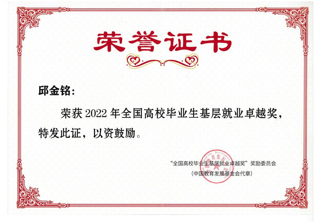 据悉,“全国高校毕业生基层就业卓越奖”是由教育部高校学生司、教育部学生服务与素质发展中心共同指导,中国长江三峡集团出资,中国教育发展基金会设立的项目,奖励为赴基层就业并做出突出业绩的普通高校毕业生和普通高校指导服务大学生赴基层就业工作有突出贡献的教师,每年遴选一次,每次奖励高校毕业生400人左右、教师60人左右,经高校推荐、省级遴选、委员会复核确认等环节,获奖人员每人奖励人民币3万元。