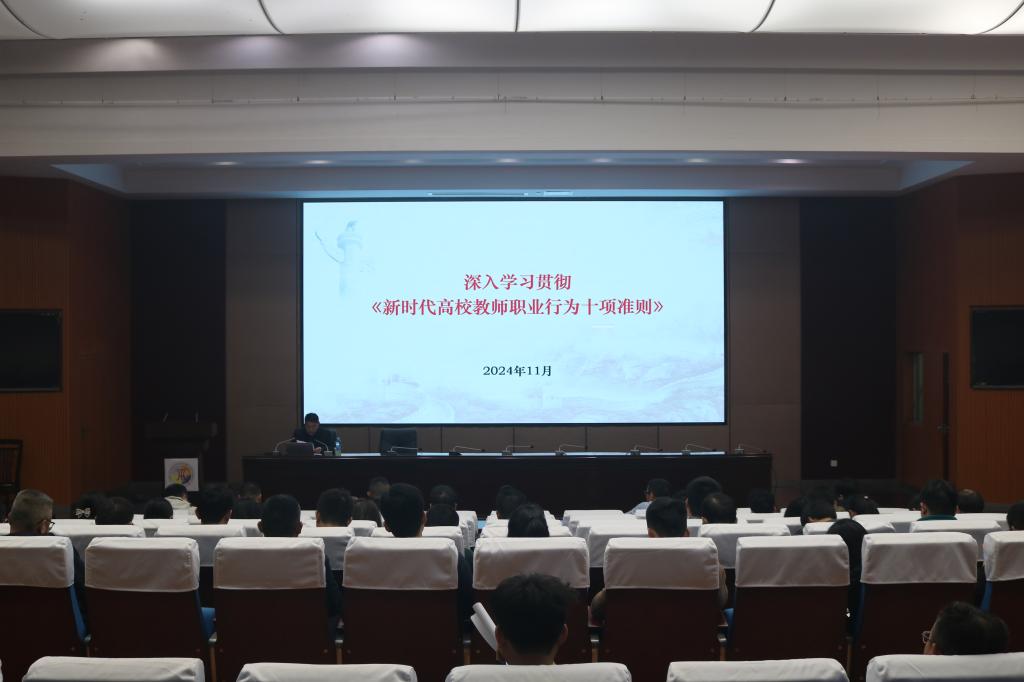 本网讯 11月19日,我院于黄金校区逸夫实验学术报告厅开展深入学习贯彻《新时代高校教师职业行为十项准则》交叉宣讲活动。化学化工学院党委书记夏李斌担任主讲,学院班子成员、全体教职工参与了本次宣讲。宣讲由学院院长何桂春主持。
